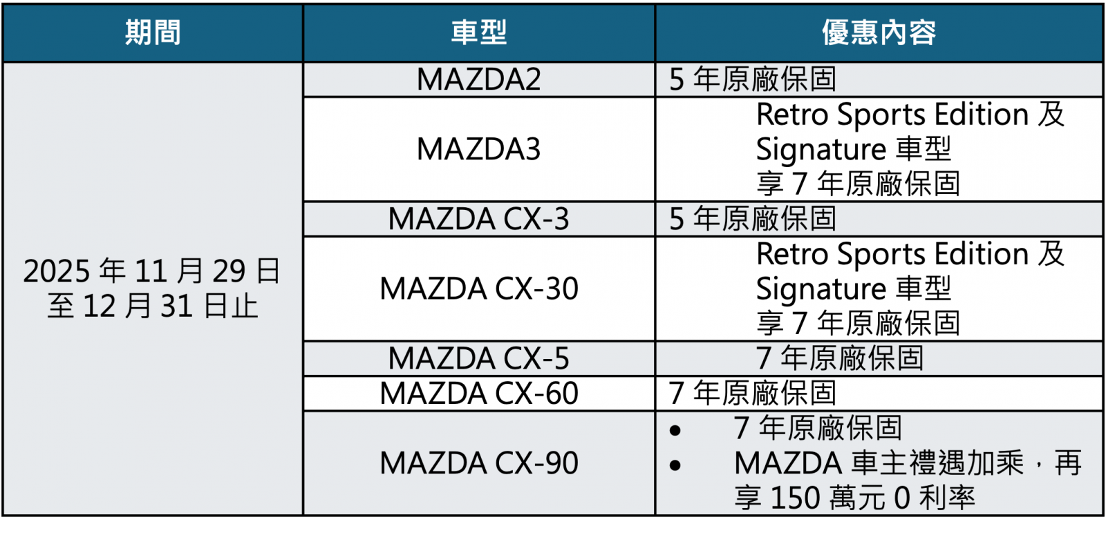 MAZDA 12 月購車優惠專案內容由台灣馬自達與 MAZDA 授權經銷商共同提供,專案僅適用於 2025 年 11 月 29 日起訂購,並於 2025 年 12 月 31 日前領牌之特定 MAZDA2/ MAZDA3/ CX-3/ CX-30/ CX-5/ CX-60/ CX-90 車型。特定車型享有的「5 年原廠保固」係指⾃領牌⽇起算 3 年或⾥程數達 10 萬公⾥ (以先屆滿者為準) 之新⾞保固期限屆滿後,可再享有 2 年不限⾥程之 MAZDA 延⻑保固;特定車型享有的「7 年原廠保固」,係指⾃領牌⽇起算 3 年或⾥程數達 10 萬公⾥ (以先屆滿者為準) 之新⾞保固期限屆滿後,可再享有 4 年不限⾥程之 MAZDA 延⻑保固,並分為兩階段,第一階段為 4-5 年「全域安心型」延長保固,第二階段為 6-7 年「核心守護型」延長保固。有關 MAZDA 延長保固之注意事項,請參閱台灣馬自達官方網站之「MAZDA 延長保固方案」說明及「MAZDA 延長保固方案權益手冊」。MAZDA 既有車主換購或增購 MAZDA CX-90 可享有「150 萬元 0 利率」優惠,新領照人限 MAZDA 既有車主或既有車主三等親以內親屬,貸款額度依車型售價與實際核貸金額為主。台灣馬自達與 MAZDA 授權經銷商保留專案內容變更及最終解釋之權利,租賃車、大宗批售、優惠批售及計程車等,不適用本專案,更多活動詳情請見台灣馬自達官方網站。