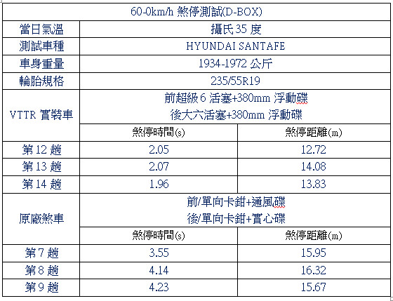 而這次受測的車型是採380mm打洞浮動碟規格,由於在非專業道路上測試,加上原廠制動性能不太了解下,因此設定60-0公里的煞停方式,實際上路發現VTTR實裝車,只要輕碰煞車就能感受力道介入,不突兀的特性一般車主應該可在換裝後幾個紅綠燈就能熟悉,而為要測是否會有熱衰竭的問題,35度高溫下VTTR實裝車其實總共測了14次,不過因為超過設定時速導致最後無法使用,圖表內的兩趟成績為最後3筆紀錄,可看出煞車遇熱後的表現,差異性其實相當微妙,就可看出該制動系統的能耐,與原廠(9次)相比將近差了2秒的時間(2-3公尺左右),性能提升相當可怕。