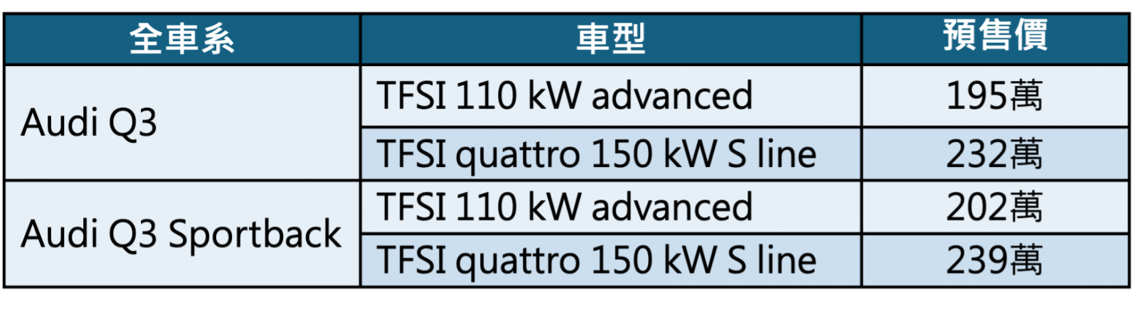 全車系Audi Q3預售價195萬元起,欲知更多Audi Q3 車系產品資訊與預售訊息,請洽全台 Audi 授權展示中心或造訪