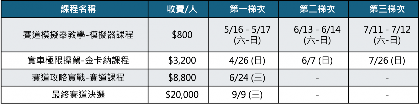 - 【賽道模擬器教學-共3堂模擬器課程】:此為提升駕駛技巧的完美第一步,學員將透過專業級模擬器註1,在虛擬環境中學習正確的賽道觀念、路線判讀與駕駛坐姿,在擬真又安全的環境下體驗真實賽道的刺激,為實車駕駛打下穩固基礎。