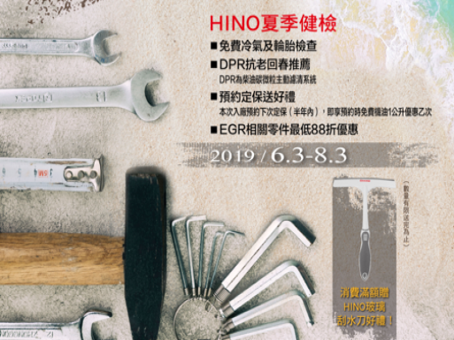 HINO商用車台灣總代理和泰汽車自2019年6月3日起至2019年8月3日止,舉辦「每一道工序 都是HINO的真心」夏季健檢活動,邀請HINO商用車、TOYOTA Coaster中巴及TOYOTA HIACE/Granvia車主回廠為愛車實施免費檢查,讓愛車能保持最佳狀態,車主安心打拼事業。