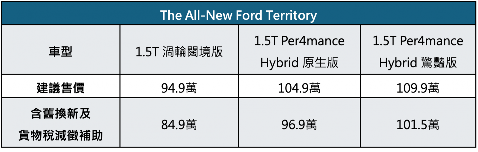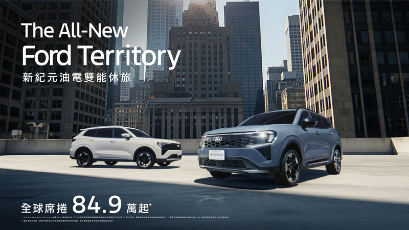 Ford全球中型休旅級距的全新力作:The All-New Ford Territory,如原廠工程開發部副總Eric Hermann所述,該車集結Ford對於家用休旅應該擁有「性能、空間、科技、個性」的全新想像,滿足消費者全方位的要望;並在全球五大洲、超過80個市場佈局陸續上市,開啟驚豔全球的休旅新紀元。福特六和正式宣布The All-New Ford Territory在台上市,本次提供1.5T Per4mance Hybrid四電驅渦輪油電及1.5T汽油渦輪雙動力,全車系共三車型,正式售價84.9萬起(含舊換新及貨物稅減徵補助),並於2025年底前入主享價值超過8萬的四大早鳥好禮,包含5年原廠保固〔註一〕、3年內建導航圖資更新、3年MyPaaK手機鑰匙2.0服務,以及專屬行李艙旗艦套件。The All-New Ford Territory於12月13日起全國全面展開試駕體驗,敬邀消費者即刻預約試駕,刷新每一次驚豔!