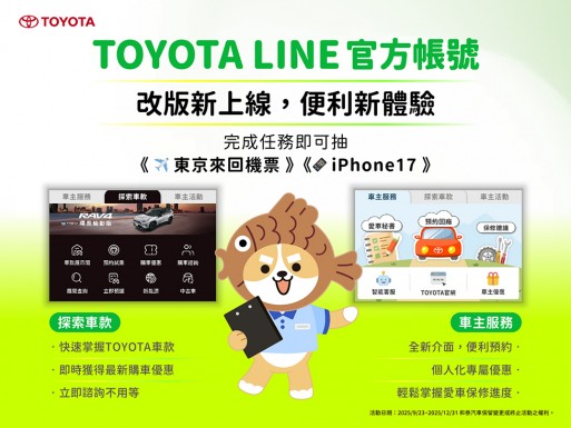 TOYOTA 秉持「不斷精進、以顧客為核心」的理念,持續推動數位轉型,並致力於提供貼近顧客需求的創新服務。全新升級的 TOYOTA LINE 官方帳號已於 9月23日正式上線;本次升級將「探索車款」與「車主服務」功能整合於同一平台,讓消費者不論規劃購車或日常保養,都能在LINE上一次完成,體驗直覺、便捷的數位服務。