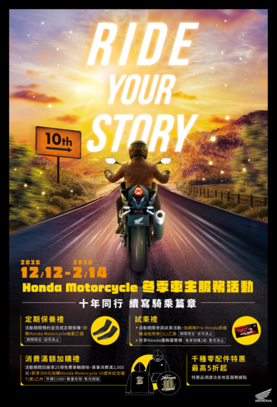 Honda Taiwan於2025/12/12至2026/2/14於Honda Motorcycle各經銷據點,舉辦「冬季車主服務活動」,活動期間回廠即可享25項免費車輛健檢,本次定期保養禮等專屬禮遇,千種指定零配件優惠活動同步開跑,邀請所有Honda Motorcycle車主回廠享受服務,一同邁向新旅程。