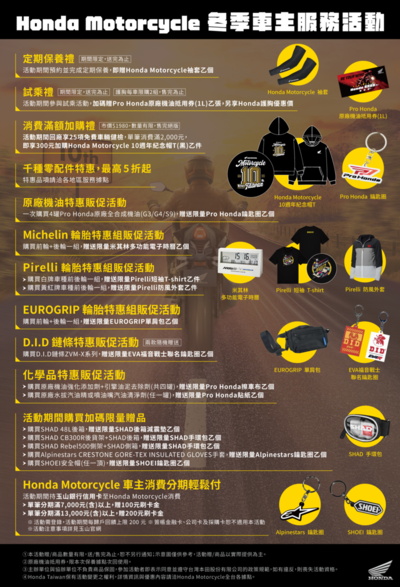 ▸ 活動期間回廠享25項免費車輛健檢,單筆消費滿2,000元,即享300元加購Honda Motorcycle 10週年紀念帽T (黑)1件 (市價$1980,數量有限,售完絕版)。