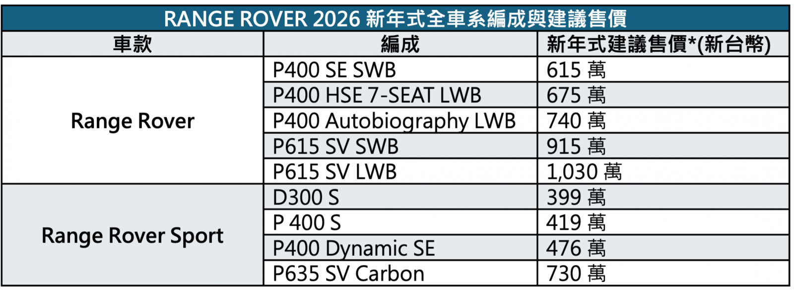 JLR 秉持 Reimagine 核心思維重新定義現代奢華,由「House of Brands」品牌策略出發,新年式車型導入全新識別,溝通 Range Rover 獨立的品牌意象。Range Rover 今(11)日宣布正式亮相 2026 年式 Range Rover 與 Range Rover Sport 完整車型編成,2026 年式 Range Rover P400 SE SWB 建議售價 615 萬元、P400 HSE 7-SEATS LWB 長軸車型 675 萬元、Autobiography 740 萬元起;Range Rover SV SWB 與 LWB 雙車型建議售價分別為 915 萬元與 1,030 萬元起。