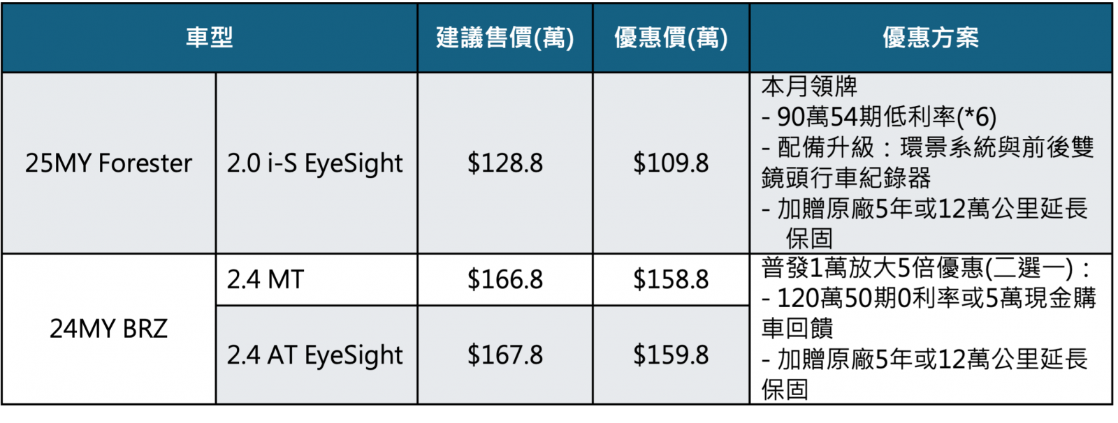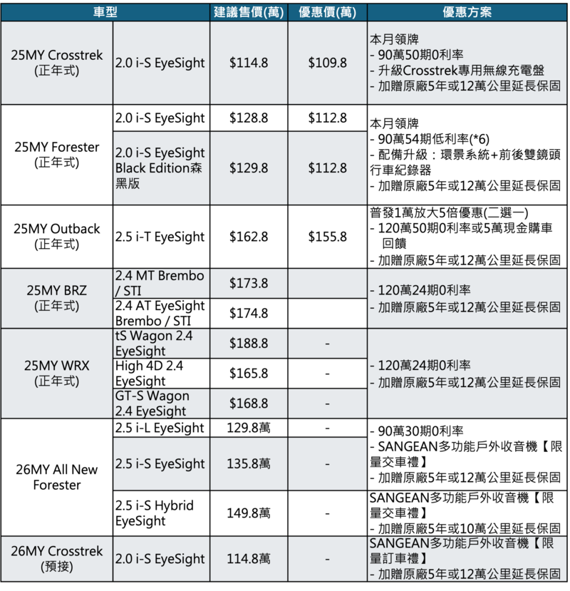 3.各車款建議售價及優惠價格資訊詳情依展示中心與經銷商現場公告為準,台灣速霸陸保留最終更動之權利。