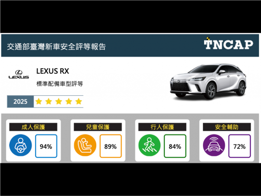 為提供消費者新車安全資訊,促使車輛產業升級,提升國內車輛安全性,國內推動臺灣新車安全評等計畫(TNCAP),在完成 114 年第三季三車型挑選、購置、試驗及評等相關作業後,今(30)日正式公布 TNCAP 第三、第四及第五順位受評車型的評等結果,LEXUS RX獲得五顆星評等,TOYOTA TOWN ACE 獲得零顆星評等,MG HS 獲得五顆星評等。